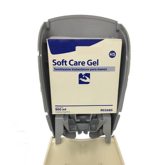 דיספנסר תלוי על הקיר עם תכשיר ג'ל היגייני לחיטוי ידיים על בסיס כוהל. SOFTCARE Med H5
