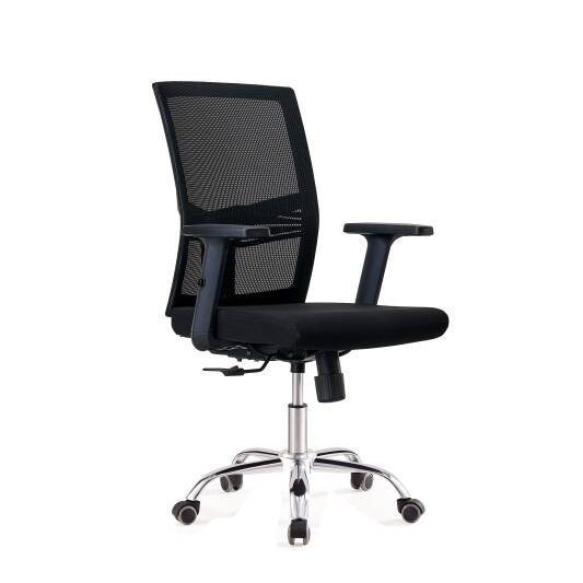 כיסא משרדי עם משענות לידיים ומנגנון הרמה מתכוונן.