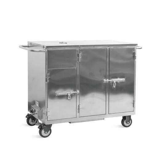 עגלת מזון מקצועית מנירוסטה עם מערכת חימום לשמירה על טמפרטורת המזון לאורך זמן. מתאימה לבתי חולים, מוסדות רפואיים ומטבחים מוסדיים, ומאפשרת הובלה נוחה ובטוחה של ארוחות תוך שמירה על איכות והיגיינה. העגלה כוללת תאי אחסון למגשי מזון, גלגלים שקטים עם בלמים וידית אחיזה לניידות קלה.